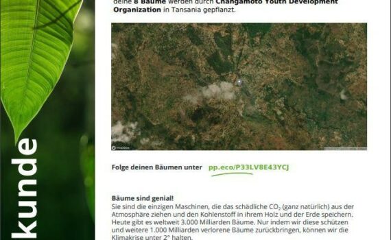 8 Trees in Tanzania, Changamoto Youth Development, Plant For The Planet https://www.davidschlegl.at/wp-content/uploads/2022/04/PlantForThePlanet_Changamoto_Youth-_Tansania_Certificate_202107.pdf